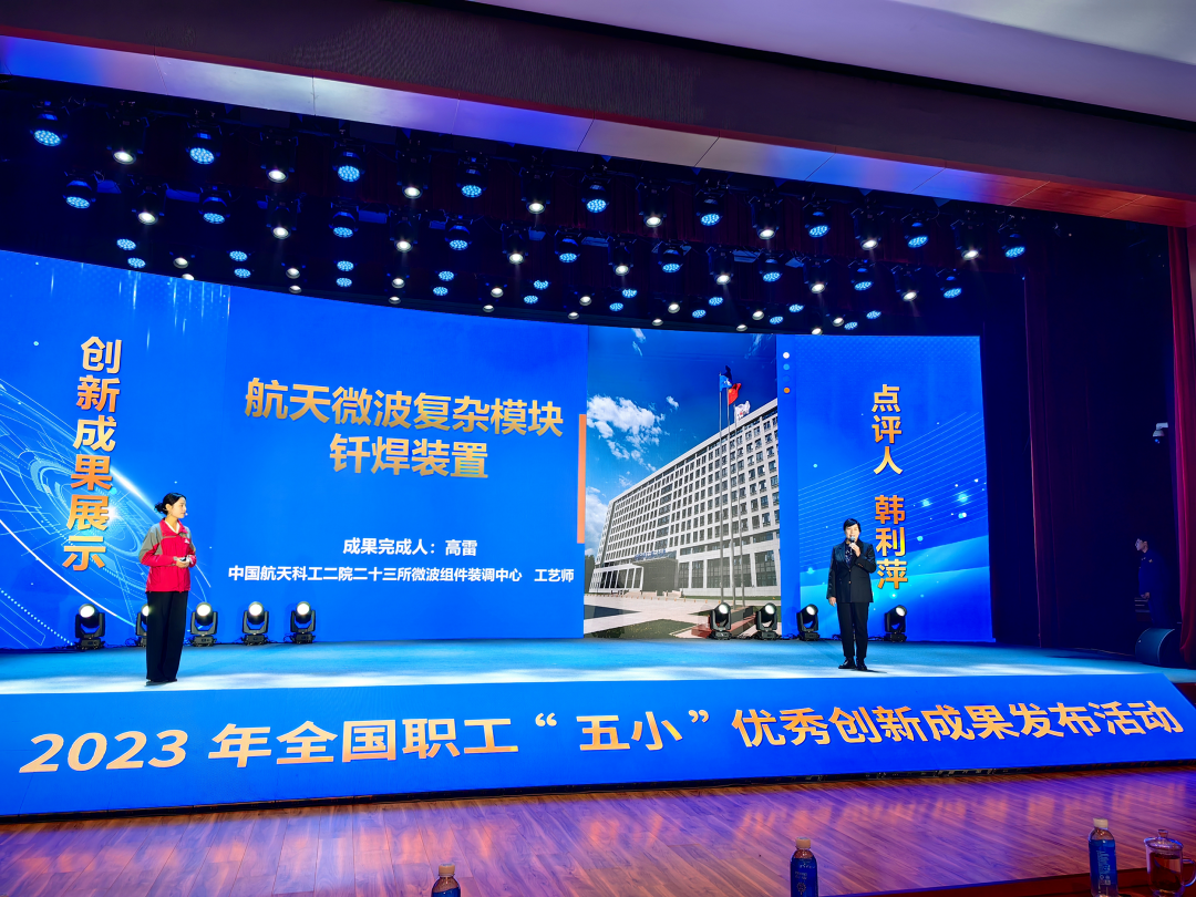 1月16日,由全國總工會勞動和經(jīng)濟(jì)工作部、中國工人出版社聯(lián)合主辦的2023年全國職工“五小”優(yōu)秀創(chuàng)新成果發(fā)布活動在江蘇徐州舉行。全國總工會副主席、書記處書記馬璐出席活動。此次發(fā)布活動揭曉了20項優(yōu)秀創(chuàng)新成果,中國航天科工二院23所微波組件裝調(diào)中心“航天微波復(fù)雜模塊釬焊裝置創(chuàng)新成果”獲此榮譽,并作為5個最具代表性作品之一在成果發(fā)布活動上進(jìn)行匯報交流,大國工匠二院二八三廠精密制造車間主任曹彥生受邀作為專家點評職工創(chuàng)新成果。