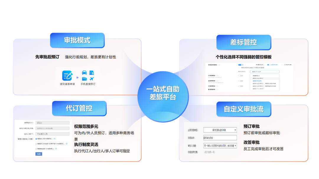 商旅服云平臺(tái)提供一站式的解決方案,幫助企業(yè)規(guī)范管理,提升大家的差旅出行體驗(yàn)。將差旅制度配置到系統(tǒng)中就能實(shí)現(xiàn)差旅標(biāo)準(zhǔn)的差異化管理,實(shí)現(xiàn)事前、事中、事后全方位監(jiān)管。