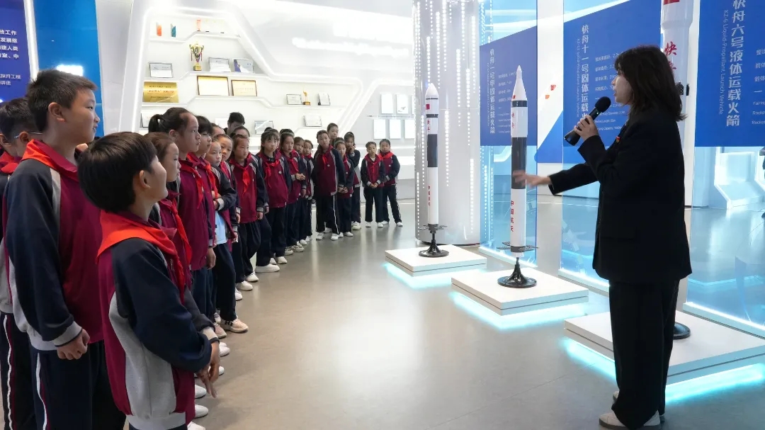隨后,少先隊(duì)員們與快舟固體運(yùn)載火箭親密接觸,現(xiàn)場參觀,并到火箭公司科普展廳開展見學(xué),豐富翔實(shí)的圖文資料、視頻動(dòng)畫、快舟系列火箭模型等,展示了中國航天事業(yè)的輝煌成就、快舟火箭的發(fā)展歷程,以及人類對未來太空探索的夢想。少先隊(duì)員們駐足觀看,不時(shí)向身邊的講解員發(fā)問,對中國航天抱有極大興趣。