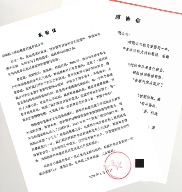 2025年農歷年到來之際,湖南航天誠遠公司陸續收到客戶單位發來的感謝信。