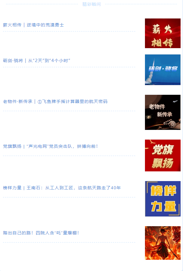 通過融媒大家談、融媒策劃會等形式,中心傾力推出精品欄目矩陣,包括工程聚焦、礪劍·驍將、老物件·新傳承、漫畫航天、薪火相傳等9大品牌欄目,記者深入一線挖掘典型事跡、先進團隊個人。未來,四院融媒體中心將持續深化媒體融合創新,將黨委的聲音發出來,將企業的形象展出來,將先進典型樹起來,為建設一流運載技術研究院注入強勁文化動能!