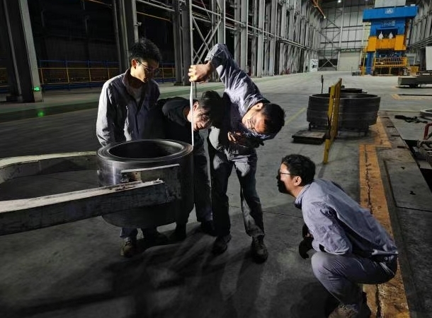 車間內(nèi),叉車的轟鳴奏響了奮斗的旋律。一位叉車司機熟練地操作設(shè)備,將鍛件穩(wěn)穩(wěn)抓起。4 名技術(shù)、生產(chǎn)骨干迅速圍攏過來,手中的卷尺成為他們攻克技術(shù)難題的有力“武器”。他們專注地測量每一處尺寸,目光在鍛件與測量數(shù)據(jù)間來回切換,不放過任何一個細(xì)節(jié)。