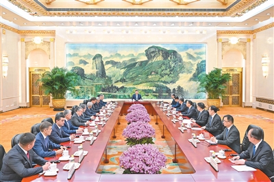 七月十五日上午,國家主席習近平在北京人民大會堂集體會見來華出席上海合作組織成員國外長理事會會議的各國外長和常設機構負責人。新華社記者殷博古攝