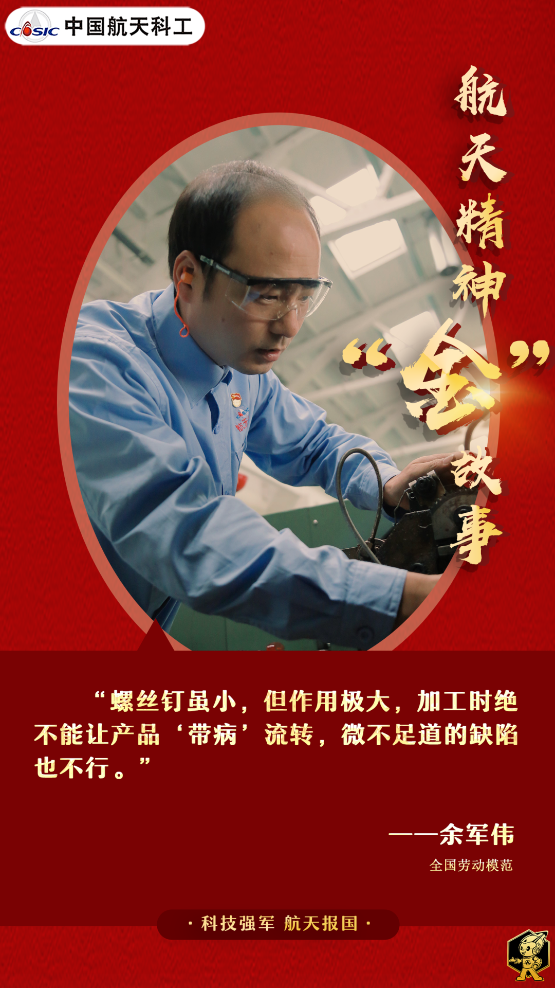 航天“萬人一桿槍”,人人都是螺絲釘。即便微小如螺絲釘,也都有機會圓夢“飛天”。但想要“上天”,必須做到嚴慎細實,必須做到“百萬無一失”,努力將錘煉人品融入鍛造產品,做到品質杠杠的,性能棒棒噠,無論“i人e人、濃人淡人”,都能成就精彩人生。