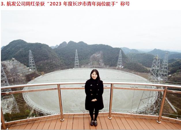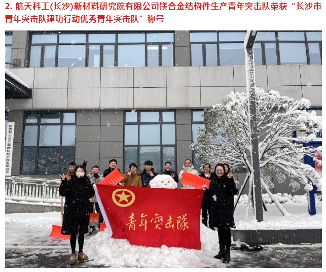 湖南航天天麓新材料檢測有限責任公司數字合格證運營班組獲評“2023年度長沙市青年文明號”稱號;航天科工(長沙)新材料研究院有限公司鎂合金結構件生產青年突擊隊獲評“長沙市青年突擊隊建功行動優秀青年突擊隊”稱號;航發公司周紅獲評“2023 年度長沙市青年崗位能手”稱號。
