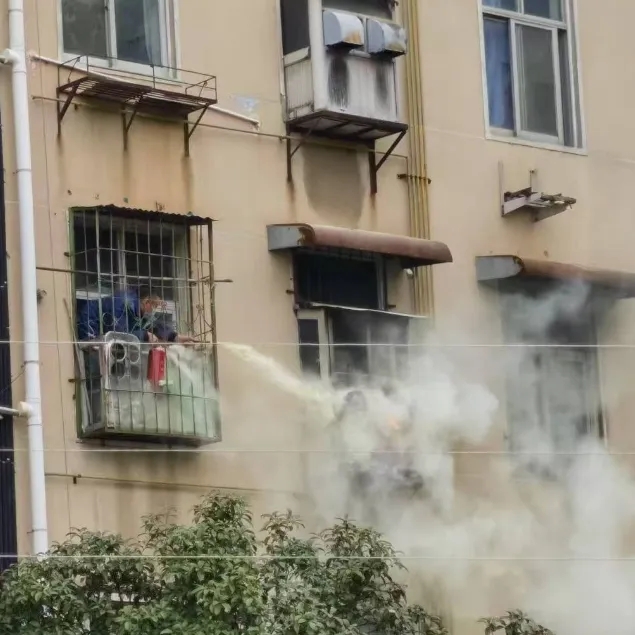 濃煙四散,航天科工九院紅陽公司廠區與該居民樓僅一墻之隔,運輸管理部梁部長發現火情后,立刻召集人手。3分鐘內,8名職工、8瓶干粉滅火器準備就緒,眾人一同奔赴現場。