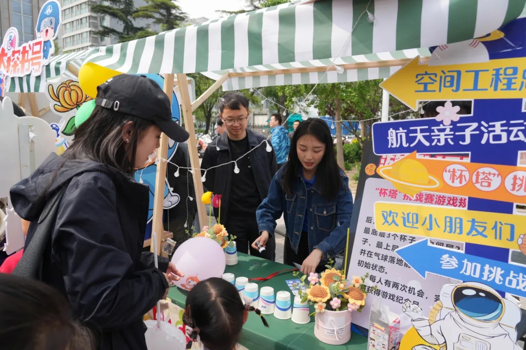 課程結(jié)束后,小朋友們?cè)诩议L(zhǎng)的帶領(lǐng)下走進(jìn)“春日航天暢游集市”,在游戲中了解導(dǎo)彈設(shè)計(jì)、運(yùn)輸、發(fā)射、命中的各個(gè)過程,既學(xué)習(xí)了導(dǎo)彈的知識(shí),也體驗(yàn)了競(jìng)技的樂趣。通過重重關(guān)卡,收集航天紀(jì)念章,獲得航天文創(chuàng)獎(jiǎng)品,再將滿載航天精神卡片埋入花盆,航天精神的種子就這樣在每一個(gè)航天職工家庭中生根發(fā)芽。